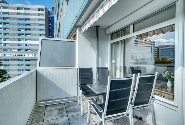 Die Wohnung befindet sich im Haus B des Ferienparks Heiligenhafen und wurde im Jahr 2026renoviert. Sie liegt in der 3. Etage und bietet einen schönen Ausblick auf den Innenhof und den Binnensee. Besonders der extra große Balkon zur Südseite lädt dazu ein, die Sonne von morgens bis abends zu genießen. Der Balkon ist mit Gartenmöbeln und einer Markise ausgestattet.