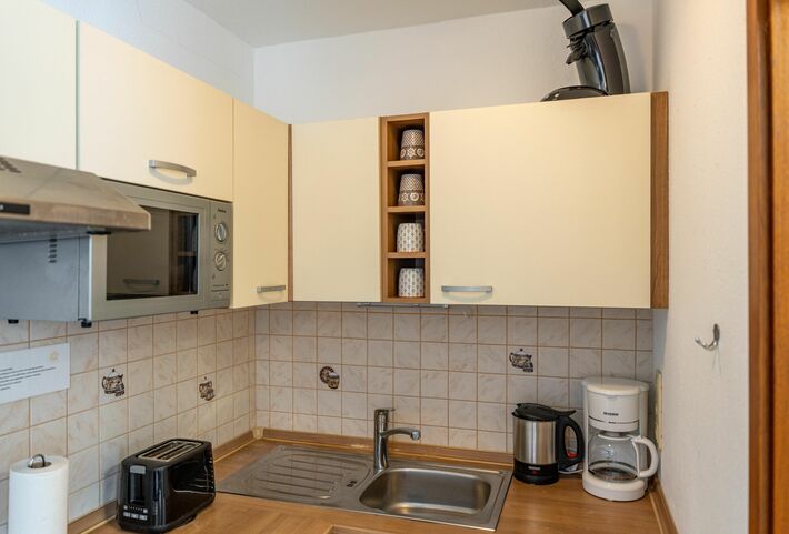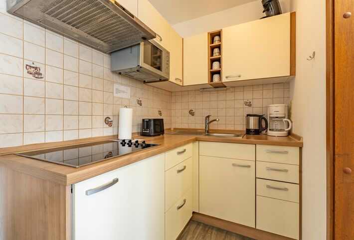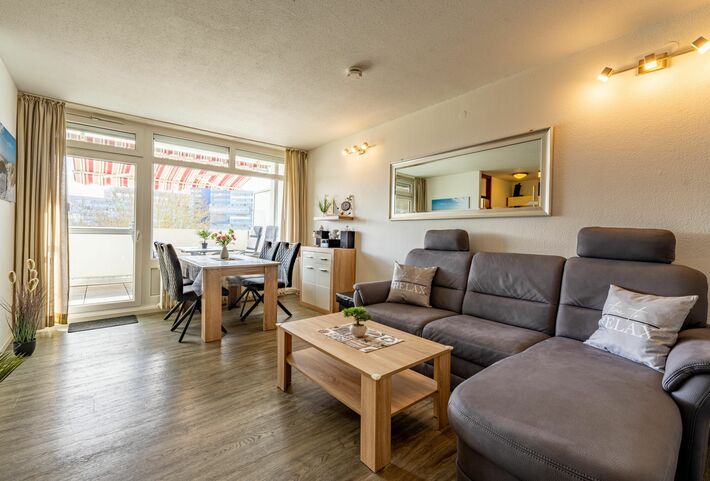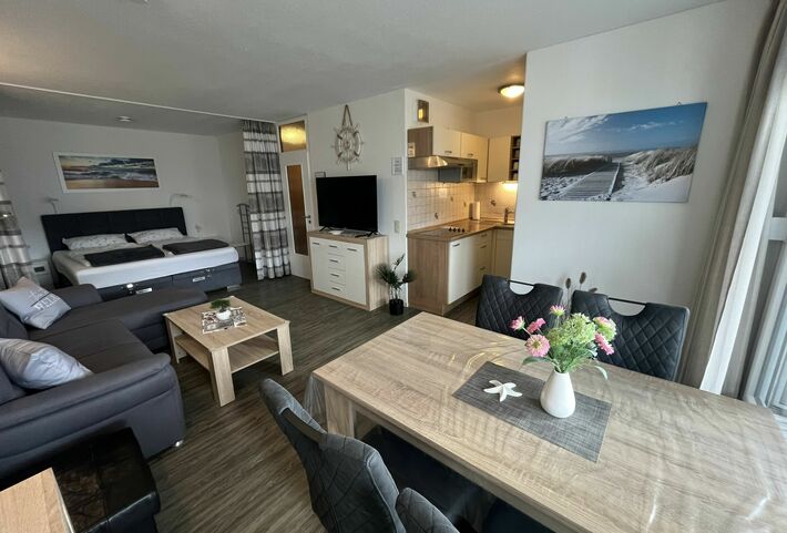 Die gemütliche Ferienwohnung bietet auf 51m² den perfekten Ort für Ihren wohlverdienten Urlaub. Sie befindet sich im 3. Stock des Haus B in Südlage, was Ihnen die Möglichkeit gibt, auf dem Balkon die Sonne zu genießen. Im Wohnzimmer finden Sie alles, was Sie für einen entspannten Aufenthalt benötigen, wie eine gemütliche Couch zum Fernsehen und eine Essecke für 4 Personen. Das Doppelbett im Wohnzimmer ist durch einen Vorhang abgetrennt und im separaten Kinderzimmer gibt es ein Etagenbett, sodass die Wohnung für bis zu 4 Personen geeignet ist. Eine voll ausgestattete Küche mit 4-Plattenherd, Mikrowelle, Kaffeemaschine, Wasserkocher, Toaster, Senseo-Padmaschine und Kochutensilien steht Ihnen ebenfalls zur Verfügung. Das Badezimmer wurde 2026 komplett Sanier und verfügt über WC, Waschbecken und Duschkabine.