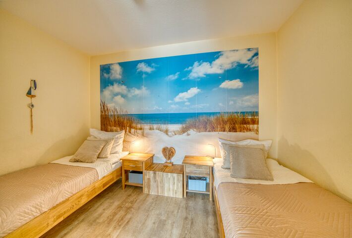 • Abgetrennter Schlafbereich mit zwei Einzelbetten und aufwendiger Fototapete als Blickfang