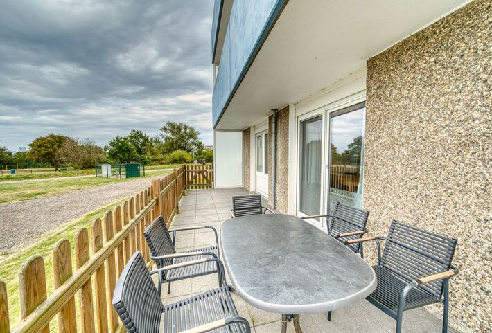 Die Ferienwohnung im Haus D, Erdgeschoss, mit Balkon zur Nordseite, bietet eine großzügige Terrasse und viel Platz für entspannte Stunden.