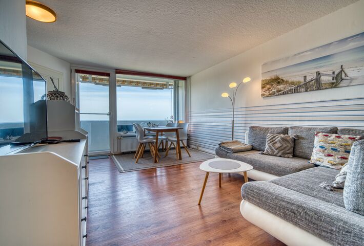 Die Ferienwohnung im Haus E, 9. Etage, mit Balkon zur Westseite, bietet einen herrlichen Ostseeblick und Sonne vom Nachmittag bis in die Abendstunden. Genießen Sie das farbenfrohe Lichterspiel des Sonnenuntergangs an der Ostsee.