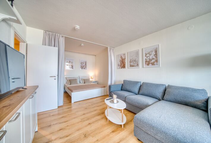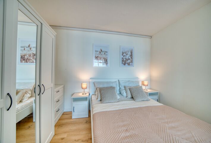 Die Ferienwohnung im Haus E, 11. Etage, mit Balkon, bietet viel Platz und einen traumhaften Blick auf die Ostsee sowie den großen Binnensee. Genießen Sie Ihr Frühstück mit Sonnenaufgängen oder den Abend durch ein buntes Farbenspiel rund um den Binnensee.