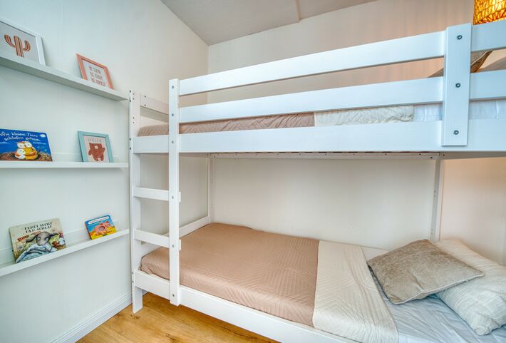 Elternschlafbereich mit Doppelbett, abgetrennt durch lichtundurchlässigen Akustikvorhang