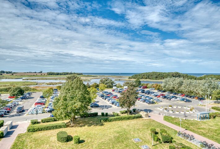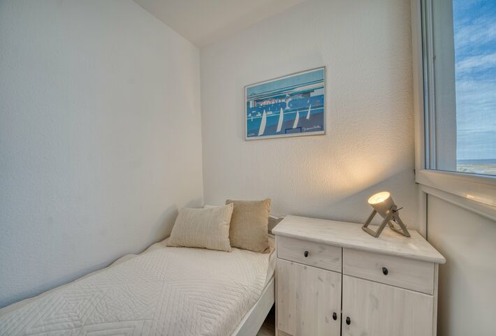 Erleben Sie entspannte Urlaubstage in dieser 45 m² großen Ferienwohnung in der 5. Etage des Hauses F im beliebten Ferienpark Heiligenhafen. Der Balkon zur Westseite bietet einen großartigen Blick auf die Ostsee und den Leuchtturm, ideal für stimmungsvolle Sonnenuntergänge am Meer.