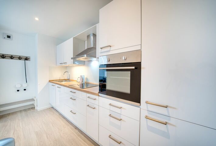 Die hochwertige Küche ist bestens ausgestattet mit Spülmaschine, Backofen, Ceranfeld, Kühlschrank mit Gefrierfach und Kaffeemaschine – hier können Sie Ihre Lieblingsgerichte zubereiten. Das moderne Badezimmer bietet eine großzügige Dusche und neuwertige Ausstattung.