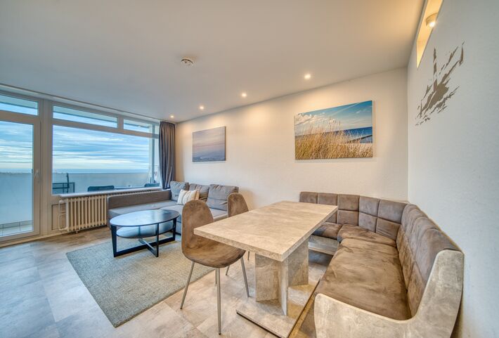 Die Ferienwohnung im Haus F, 10. Etage, mit Balkon zur Westseite, bietet einen herrlichen Blick auf die Ostsee und den Leuchtturm Richtung Steilküste. Genießen Sie von hier aus die einzigartigen Sonnenuntergänge.