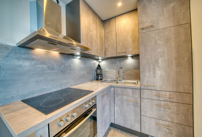• Voll ausgestattete Küche: 4-Platten-Ceranfeld, Backofen, Kühlschrank ohne Gefrierfach, Mikrowelle, Kaffeemaschine, Wasserkocher, Toaster, Geschirrspüler
