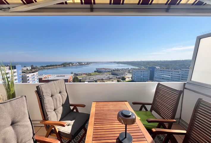 Die Wohnung 0F1202 liegt im Haus F Ferienpark, in der 12. Etage, und verfügt über den größten Balkon im gesamten Ferienpark – ideal für Frühstücke in der Morgensonne oder entspannte Abende mit Blick auf die Landschaft und spektakuläre Sonnenaufgänge.