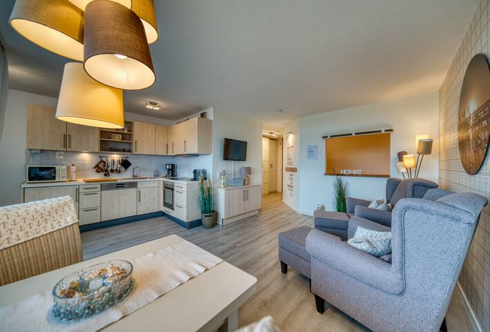 Wichtiger Hinweis: Die Sessel im Wohnzimmer werden zum Start der Vermietung durch eine Schlafcouch getauscht.