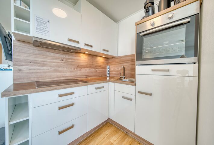Voll ausgestattete Küche mit Geschirrspüler, Backofen, Ceranherd, Kühlschrank mit Gefrierfach