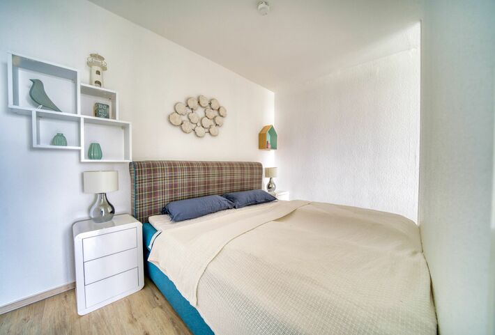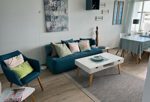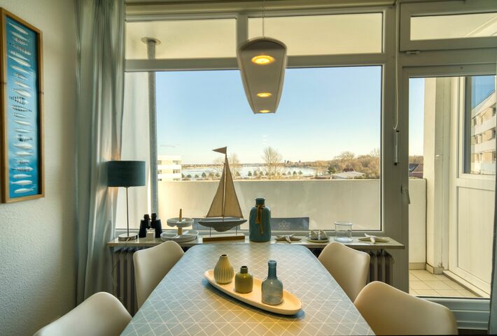 Verbringen Sie Ihren Ostseeurlaub in dieser geschmackvoll und maritim eingerichteten Ferienwohnung im Haus M des beliebten Ferienparks Heiligenhafen. Die Wohnung in der 5. Etage bietet auf ca. 45 m² komfortablen Platz für bis zu 4 Personen und verfügt über einen Balkon mit schönem Blick auf den Binnensee und die Straße – ideal für erholsame Stunden in der Abendsonne.