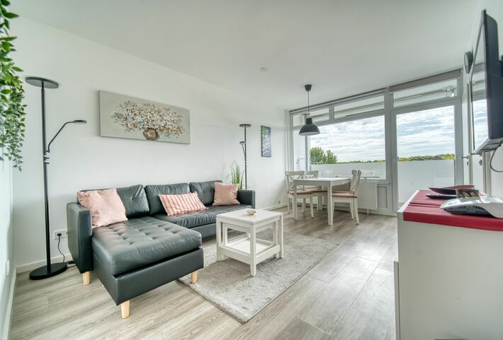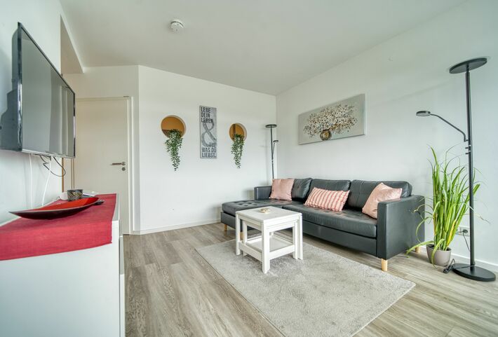 Wohnzimmer mit gemütlichem Sofa, Flachbild-TV und Esstisch direkt vor dem sonnigen Südbalkon