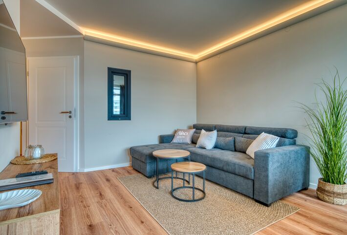 * Offener Wohnbereich mit komfortablem Sofa mit Schlaffunktion und verstellbaren Kopfteilen, Essplatz für bis zu 5 Personen und Flachbildfernseher