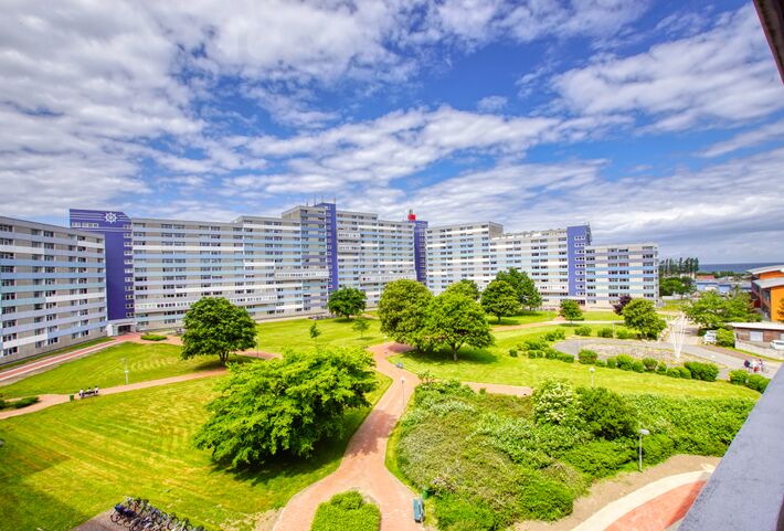 Der Balkon in Nord-Ostlage bietet einen entspannten Blick auf die gepflegten Grünanlagen des Ferienparks, sowie einen seitlichen Meerblick.