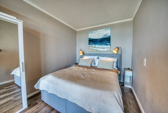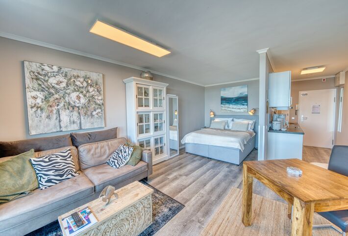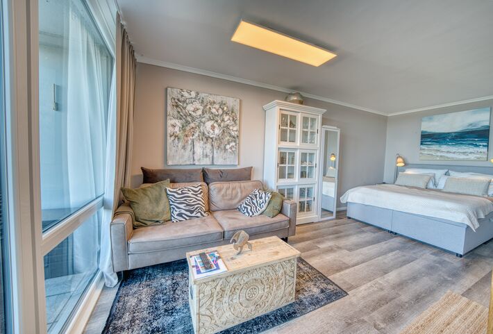 Wohn-/Schlafzimmer mit Doppelbett, Flachbildfernseher & gemütlichem Ecksofa