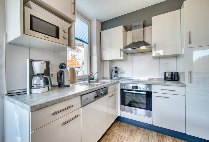Küche: Küchenzeile mit Herd, Backofen, Kühlschrank mit Gefrierfach, Geschirrspüler, Spülbecken, Mikrowelle, Kaffeemaschine, Senseo-Kaffeepadmaschine, Wasserkocher und Toaster