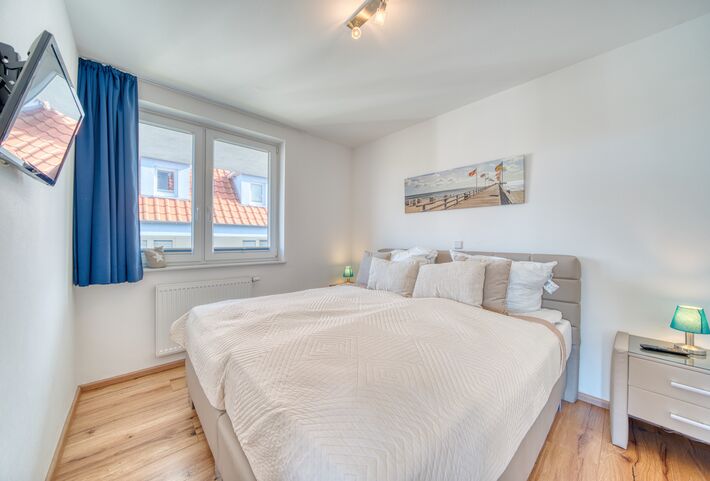 Schlafzimmer 1: Doppelbett (180 × 200 cm, zwei Matratzen je 90 × 200 cm), Kleiderschrank, SAT-TV